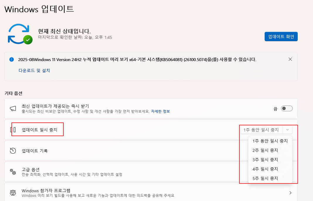 - ‘업데이트 일시 중지’ 기능 사용 (최대 5주까지 가능)