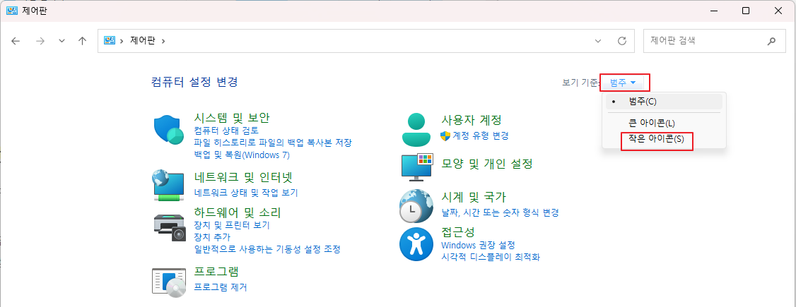 - 보기기준을 범주 -> 작은 아이콘으로 변경 선택