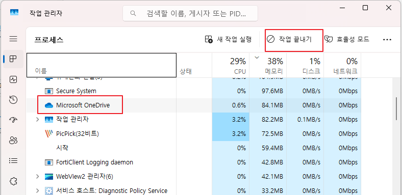 - CPU나 메모리를 많이 차지하는 항목 중 불필요한 프로그램은 마우스 우클릭 → 작업 끝내기