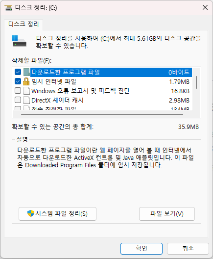 - 윈도우 키 → ‘디스크 정리’ 검색 후 실행