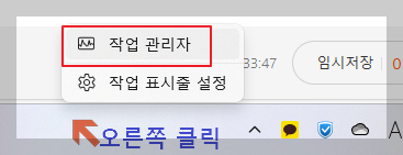 - 작업표시줄 빈 곳에 오른쪽 클릭 또는 Ctrl + Shift + Esc 눌러 작업 관리자 실행